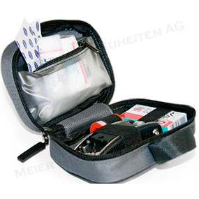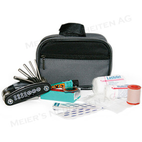 Biker Set mit folgender Füllung: 1 Kombi-Fahrrad-Werkzeug-Tool D565 aus Karbon-Stahl, 1 Schlauch-Reparatur-Set 17/XX, 2 Reifenmontagehebel, Hartmann-Verbandsmaterial (1Mullbinde, 1 Fixierbinde, 1 Heftpflaster-Rolle, 1 Kompresse und 4 Pflasterstreifen).