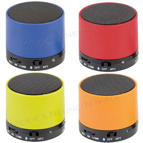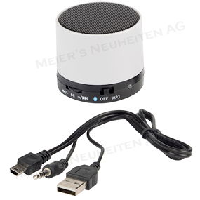 Bemerkungen: Bluetooth-Speaker in Zylinderform mit einer Leistung von 3 Watt, Slot für Micro-SD-Karten, inkl. Aufladekabel (von USB auf Mini-USB- und 3,5 mm Line-In Anschluss), spielt MP3 ab, mit Freisprechfunktion, kompatibel zu Bluetooth, mit FM Radio-Funktion, integrierter aufladbarer Akku mit 450 mAh, mit gummierten Boden für sicheren Halt.