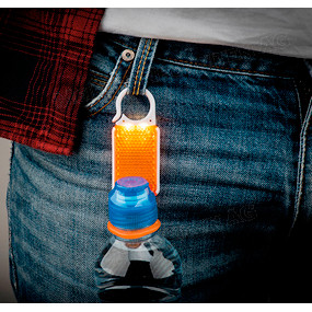 Bemerkungen: Flaschenhalter mit Reflektor inklusive 3 LED Leuchten mit 2 unterschiedlichen Lichteinstellungen. Einfach mit dem Karabiner-Haken anhängen.