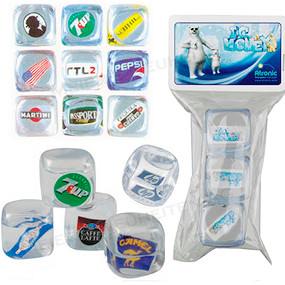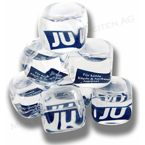 Logo-Eiswürfel kühlen Drinks, Früchte, Fisch usw. länger als Frisch-Eis (der Logowürfel wird mit destilliertem Wasser gefüllt), ohne die Getränke zu verwässern. Geschmacks und Geruchs neutral! Der Logo-Eiswürfel ist der erste glasklare Eiswürfel mit eingelegtem Markenlogo! Mit dem Logo-Eiswürfel erreichen Sie im Acrylkühler eine dauerhafte Flaschenkühlung von ca. 4 Stunden ohne lästiges Nachlegen von Frisch-Eis. Logo-Eiswürfel haben kein Abtropfwasser, darum können Sie auch bei Verletzungen problemlos kühlen. |