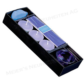 Duftset bestehend aus 3 Duftkerzen mit Orangen-, Apfel-, Lavendel-, Ocean-, oder Zitronen-Geschmack, Teelichthalter aus Glas, 10 Stk.Räucherstäbchen, Keramikhalter für die Räucherstäbchen in Blattform.