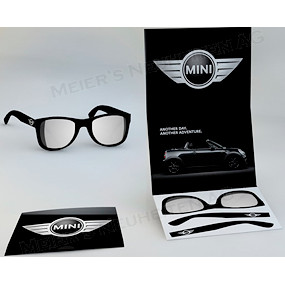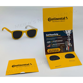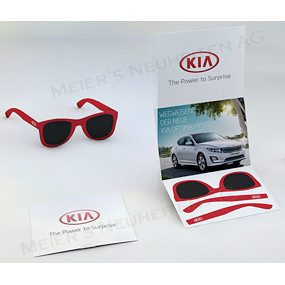 Die Karton Brille im Bausatz als dreiteilige Postkarte mit eingestanzter Sonnenbrillen. Die Postkarte kann vollflächig farbig bedruckt werden. Die Brille ist mit einer UV400 Folie ausgestattet.